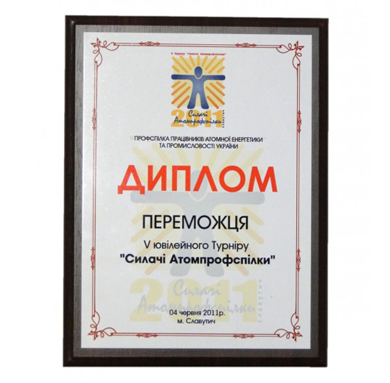 Диплом на деревянной плакетке, цвет металла - серебро матовое, размеры: 10Х15, 15Х20, 20Х25, 22Х30, 30Х38 см.