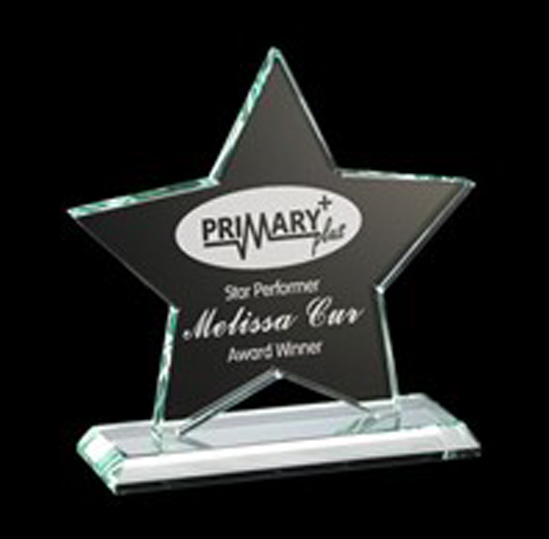 Стеклянная награда в форме звезды с гравировкой или печатью по стеклу.