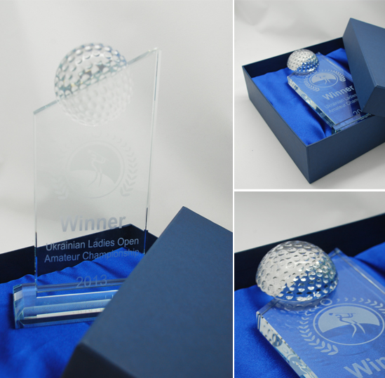 Награда из стекла для гольф-турнира в подарочной упаковке.